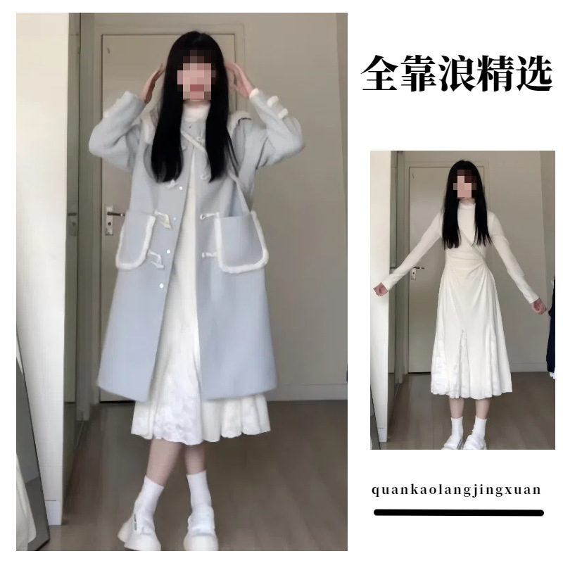 商品名称:温柔甜美双面穿设计感皮毛一体加厚气质毛呢子大衣外套打底连衣裙